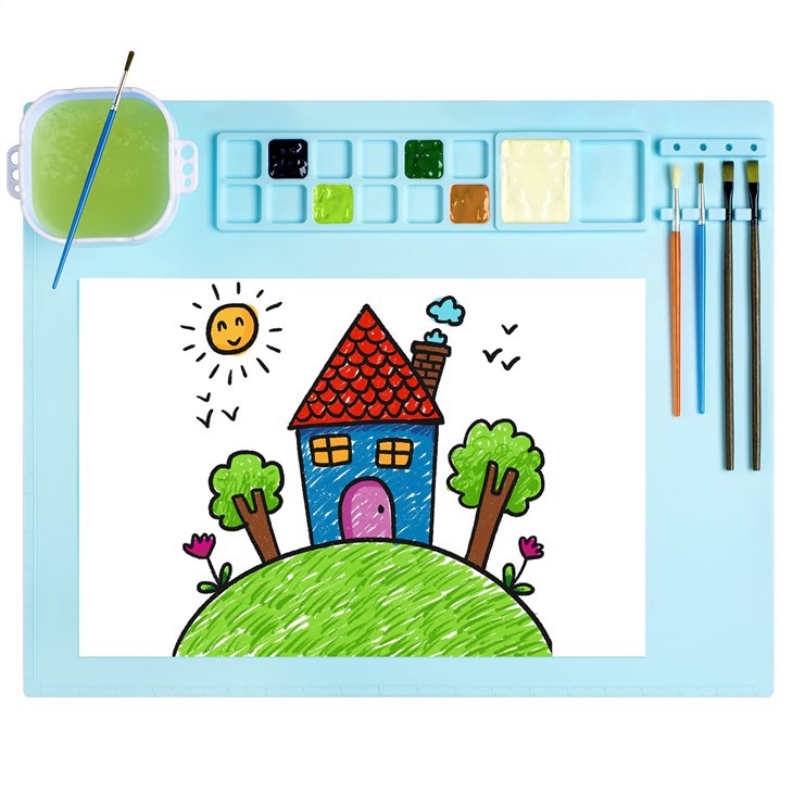 3. Sa a mete ajou tapi atizay silikone prezante de gwo plato penti wonn pou melanje efikas, yon tas netwayaj bwòs ki rabat, ak kapasite pou yo itilize kòm yon palèt penti ak palèt. Mat kreyatè silicone sa a gen balans sou bò gòch ak anba ki pi pratik pou pwodiksyon atistik ou.