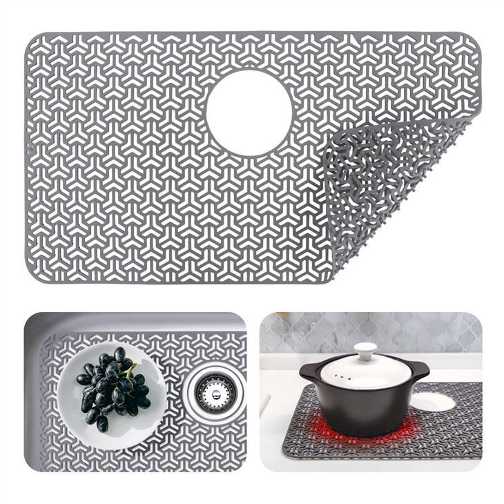 Mat koule silikone a se pliable ak antiwouy. Li ka efektivman anpeche tabl frajil kraze si yo aksidantèlman tonbe nan koule a epi evite grate asye pur ak lavabo seramik. Pwoteksyon koule silicone pou lavabo kwizin yo dirab epi yo pa pral rouye kontamine koule a.