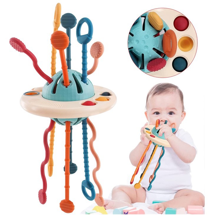 Koulè klere yo itilize nan montessori ufo silicone rale jwèt la pou ankouraje kwasans vizyèl ti bebe a. Fòm nan avyon an fè li senp pou tibebe yo pwan epi kenbe, Pou tande ak fè eksperyans divès kalite bri ak vibrasyon, epi rale fil yo soti nan yon bò nan lòt la. Kapasite motè, eksplorasyon sansoryèl, ladrès motè amann, ak kowòdinasyon men-je tout ankouraje lè w sèvi ak kòd teksti ak grip.
